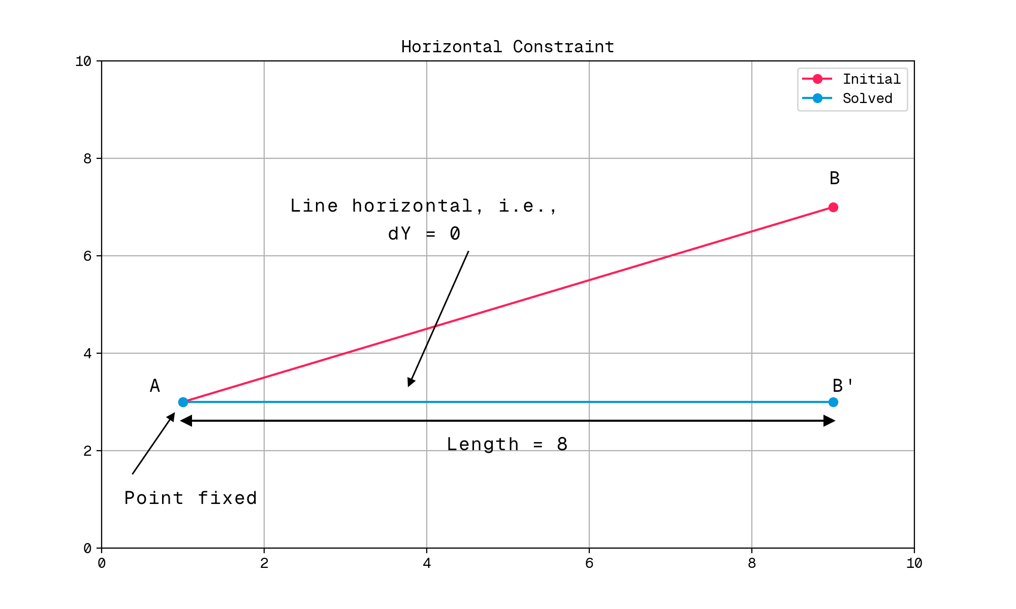 A year on from when I first discovered SolveSpace, at the next Christmas break, I figured I would have a stab at building a geometric constraint solver of my own.